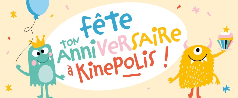 *CONDITIONS DE L'OFFRE ANNIVERSAIRE : valable tous les jours, en fonction des disponibilités, non cumulable avec toute autre offre promotionnelle. Tarif de 13,95€ par enfant, hors suppléments, incluant : 1 film à l'affiche et **1 Kids Box = menu enfant composé d’un pop-corn sucré Jimmy’s 27gr + un Smarties 38gr + une boisson au choix (sous réserve de disponibilité des produits) parmi Vittel 33cl ou Oasis Tropical 25cl ou Lipton Ice Tea Pêche 20cl ou Vittel Up Fraise BIO 33cl (produit proposé sur certains sites uniquement). Tarif de 8,90€ par adulte accompagnant, hors suppléments et sans menu. Offre réservée aux enfants âgés de 4 à 12 ans accompagnés au minimum d’un adulte. La réservation ne peut excéder 16 personnes, adulte(s) accompagnant(s) inclus (3 adultes maximum par réservation), sauf pour Kinepolis Waves et Kinepolis Amphithéâtre où la réservation ne peut excéder 12 personnes, adulte(s) accompagnant(s) inclus. Dans le cadre des anniversaires enfants, l’ensemble des mesures sanitaires en vigueur dans nos cinémas doit être respecté. Les enfants de moins de 3 ans sont acceptés, néanmoins la gratuité de n’applique pas. L'espace dédié est à disposition pendant 2h après la séance en fonction des disponibilités. L'encadrement de la fête d'anniversaire ainsi que la décoration et le nettoyage de l'espace ne sont pas inclus dans l'offre et sont sous la responsabilité de l'organisateur. Par ailleurs, pour des raisons de sécurité, l'utilisation de bougies est interdite. Une somme de 30€ (en chèque ou espèces) sera demandée lors du règlement total ; cette caution vous sera restituée après vérification du bon état de l'espace (kit de ménage fourni). Cette somme sera encaissée si le nettoyage n'est pas effectué par vos soins. Pré-réservation sur kinepolis.fr/anniversaire-enfant au minimum 7 jours avant la date souhaitée. La réservation n'est définitive qu'après le paiement total de la prestation. Une fois le règlement effectué, il n'est plus possible de réduire le nombre d'invités. En revanche, vous avez toujours la possibilité d'en ajouter, jusqu'au mercredi précédent la séance et dans la limite du nombre de participants indiqué ci-dessus.