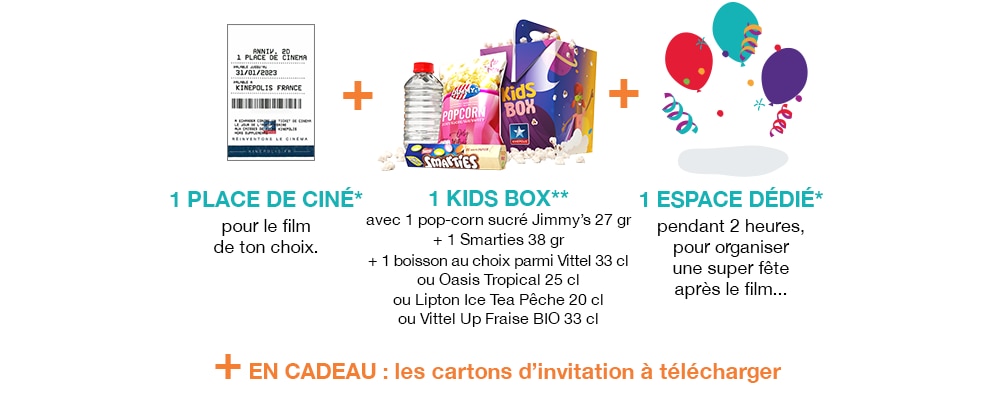 *CONDITIONS DE L'OFFRE ANNIVERSAIRE : valable tous les jours, en fonction des disponibilités, non cumulable avec toute autre offre promotionnelle. Tarif de 13,95€ par enfant, hors suppléments, incluant : 1 film à l'affiche et **1 Kids Box = menu enfant composé d’un pop-corn sucré Jimmy’s 27gr + un Smarties 38gr + une boisson au choix (sous réserve de disponibilité des produits) parmi Vittel 33cl ou Oasis Tropical 25cl ou Lipton Ice Tea Pêche 20cl ou Vittel Up Fraise BIO 33cl (produit proposé sur certains sites uniquement). Tarif de 8,90€ par adulte accompagnant, hors suppléments et sans menu. Offre réservée aux enfants âgés de 4 à 12 ans accompagnés au minimum d’un adulte. La réservation ne peut excéder 16 personnes, adulte(s) accompagnant(s) inclus (3 adultes maximum par réservation), sauf pour Kinepolis Waves et Kinepolis Amphithéâtre où la réservation ne peut excéder 12 personnes, adulte(s) accompagnant(s) inclus. Dans le cadre des anniversaires enfants, l’ensemble des mesures sanitaires en vigueur dans nos cinémas doit être respecté. Les enfants de moins de 3 ans sont acceptés, néanmoins la gratuité de n’applique pas. L'espace dédié est à disposition pendant 2h après la séance en fonction des disponibilités. L'encadrement de la fête d'anniversaire ainsi que la décoration et le nettoyage de l'espace ne sont pas inclus dans l'offre et sont sous la responsabilité de l'organisateur. Par ailleurs, pour des raisons de sécurité, l'utilisation de bougies est interdite. Une somme de 30€ (en chèque ou espèces) sera demandée lors du règlement total ; cette caution vous sera restituée après vérification du bon état de l'espace (kit de ménage fourni). Cette somme sera encaissée si le nettoyage n'est pas effectué par vos soins. Pré-réservation sur kinepolis.fr/anniversaire-enfant au minimum 7 jours avant la date souhaitée. La réservation n'est définitive qu'après le paiement total de la prestation. Une fois le règlement effectué, il n'est plus possible de réduire le nombre d'invités. En revanche, vous avez toujours la possibilité d'en ajouter, jusqu'au mercredi précédent la séance et dans la limite du nombre de participants indiqué ci-dessus.